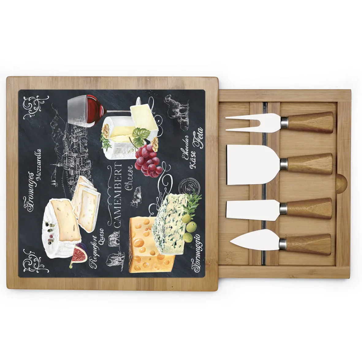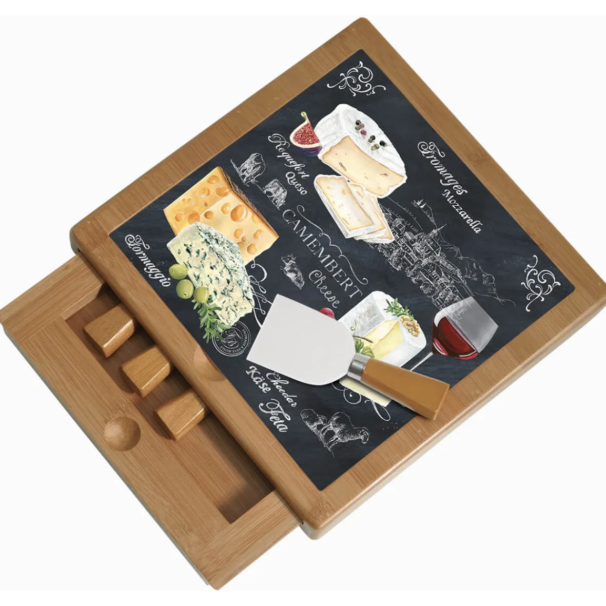 Planche à fromage en bambou avec plateau en verre et couteaux WORLD OF CHEESE